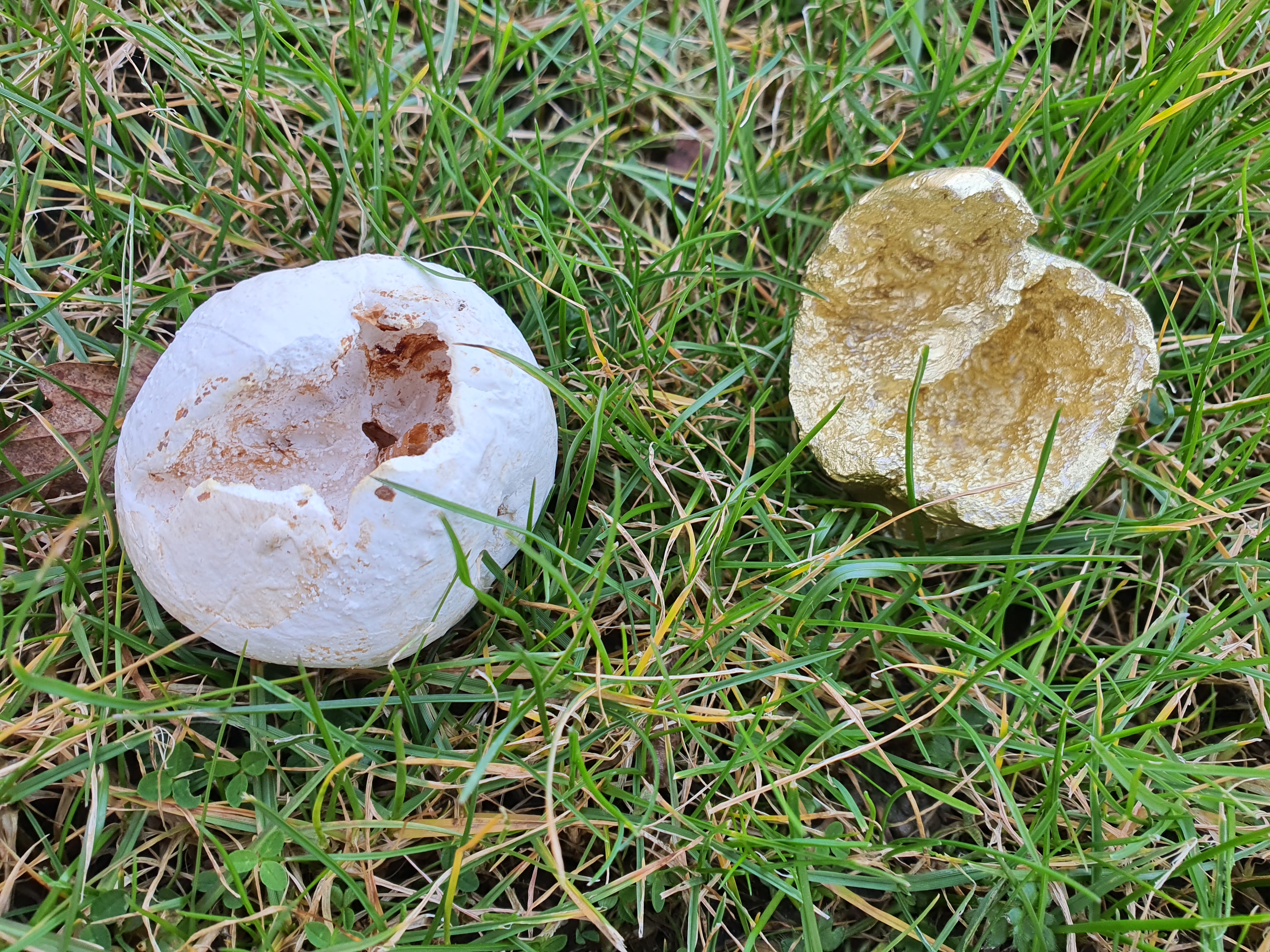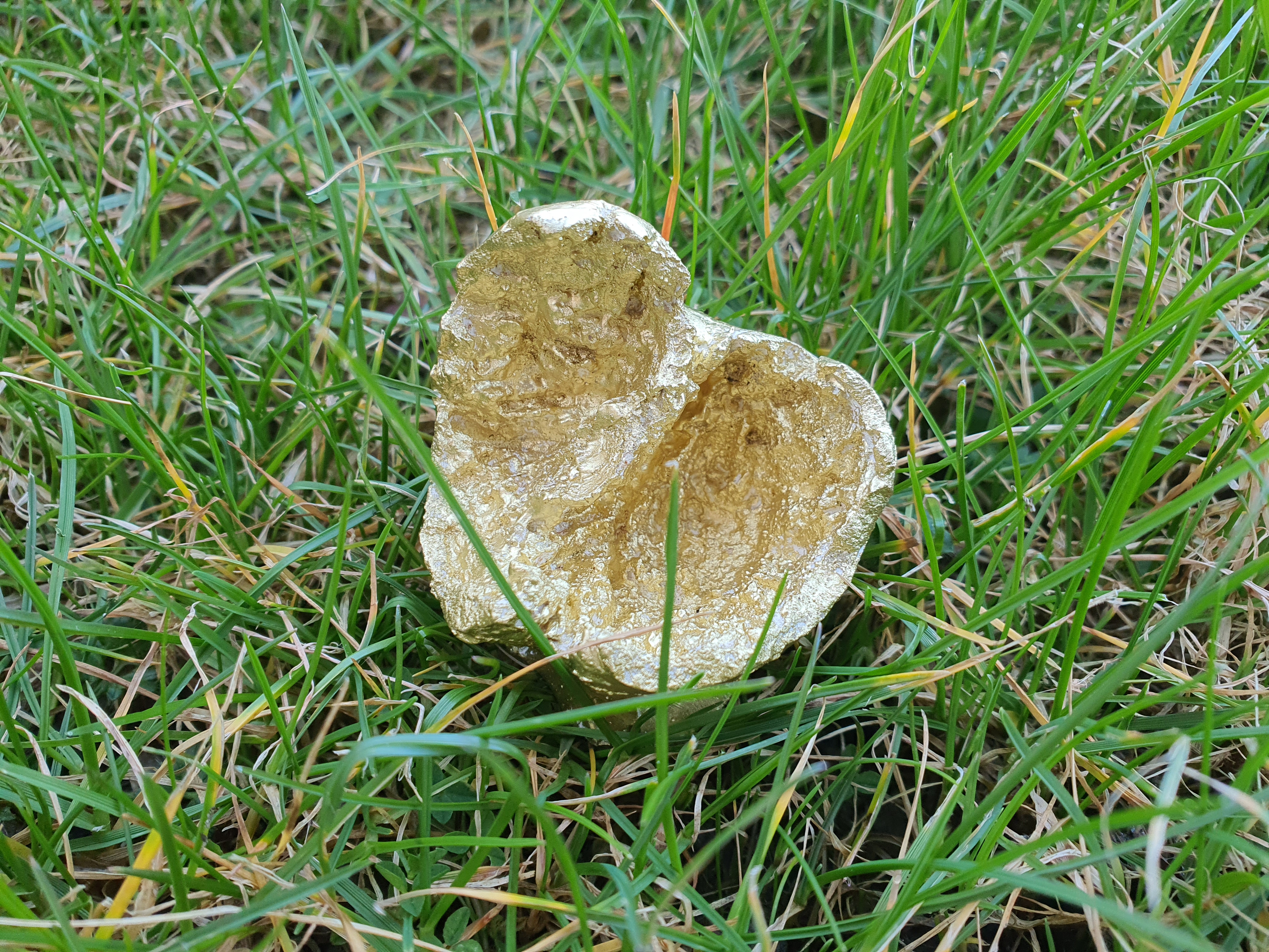 Plaster casts of apples sculpted by magpies, gold paint